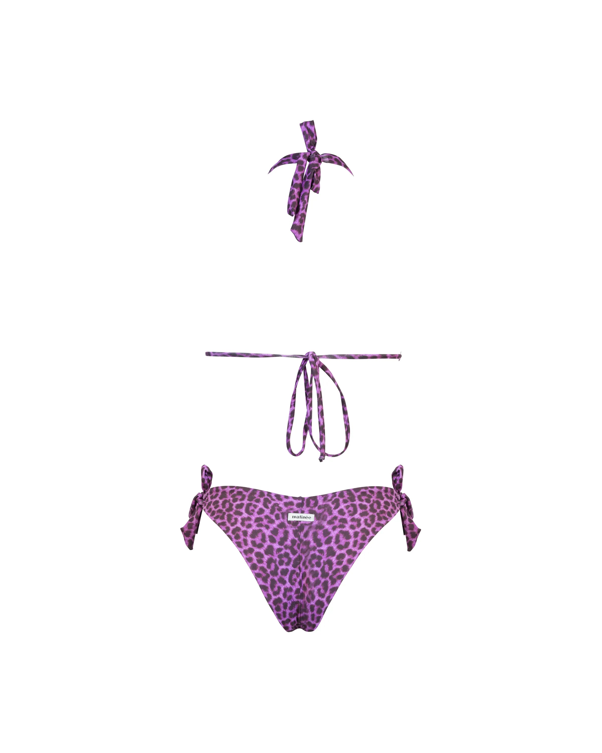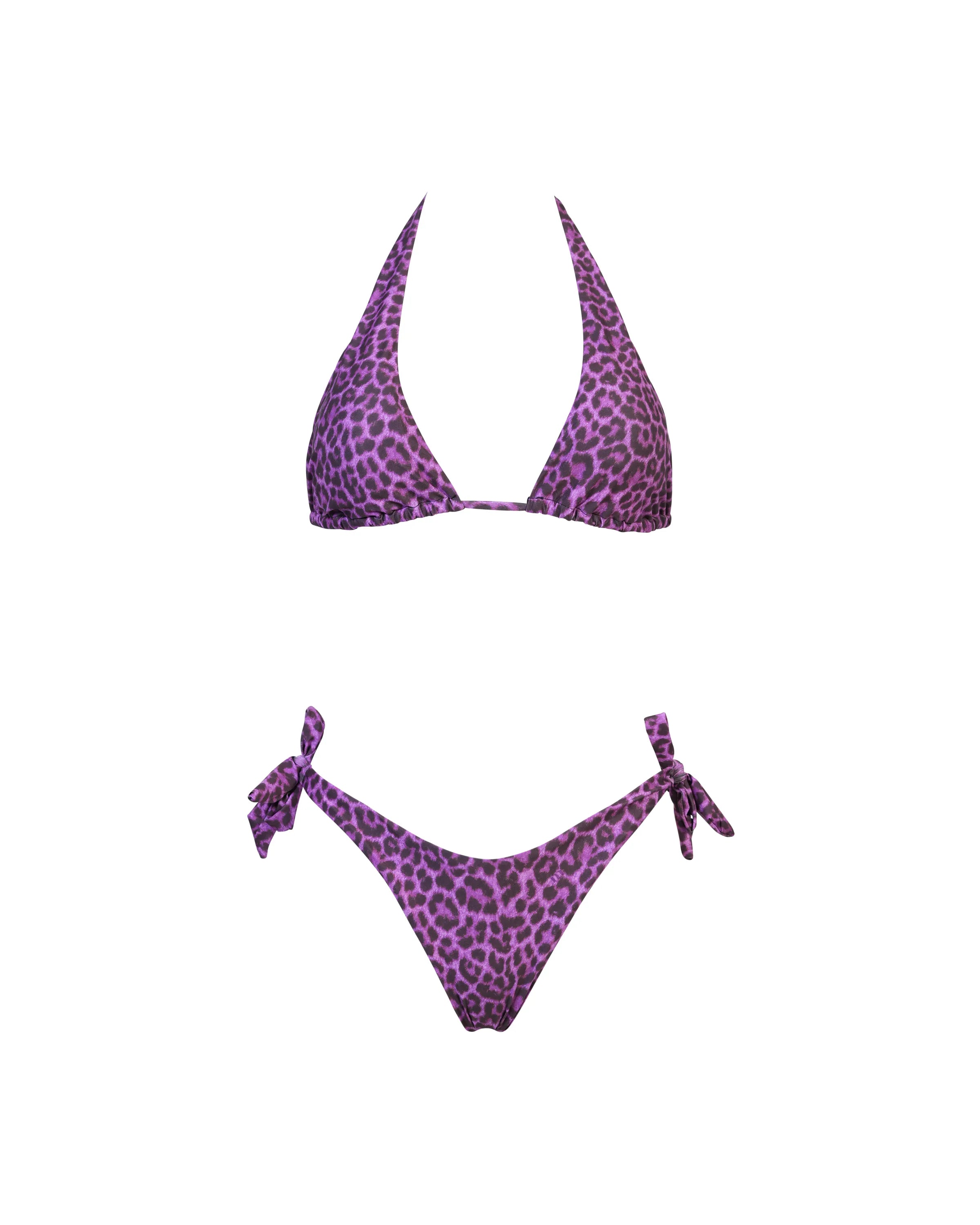 Benedetta is a super trendy bikini that combines a wide triangle top, fixed shoulder straps, and a removable cup. The Brazilian-cut bottoms feature ties at the sides, allowing you to customize them to your figure. Featuring a purple spotted pattern .