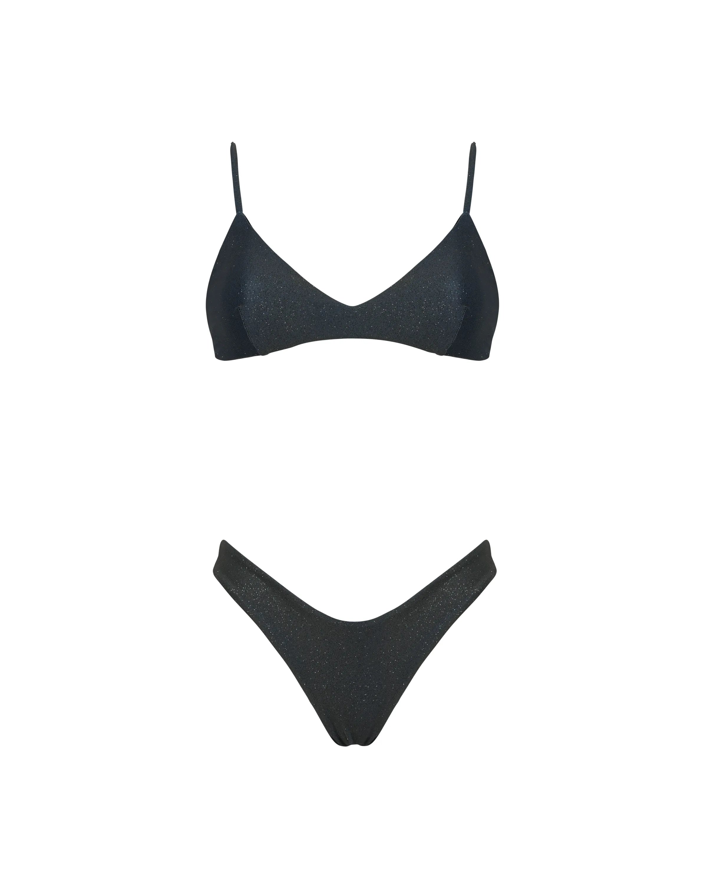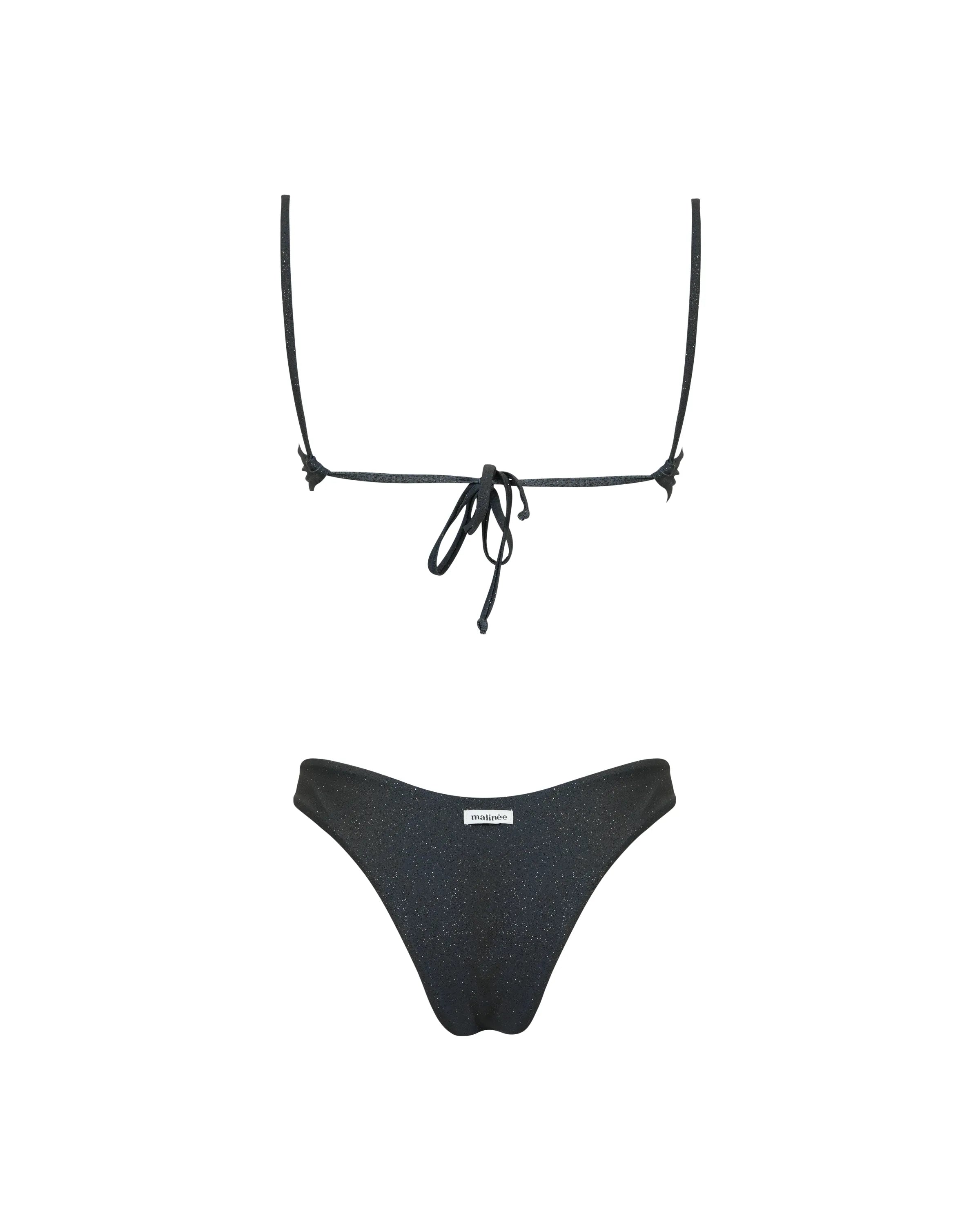 Tina is a bikini that combines a bandeau top with a low neckline, featuring removable padding, and Brazilian V-cut bottoms. The top has an adjustable tie closure for maximum customization.
