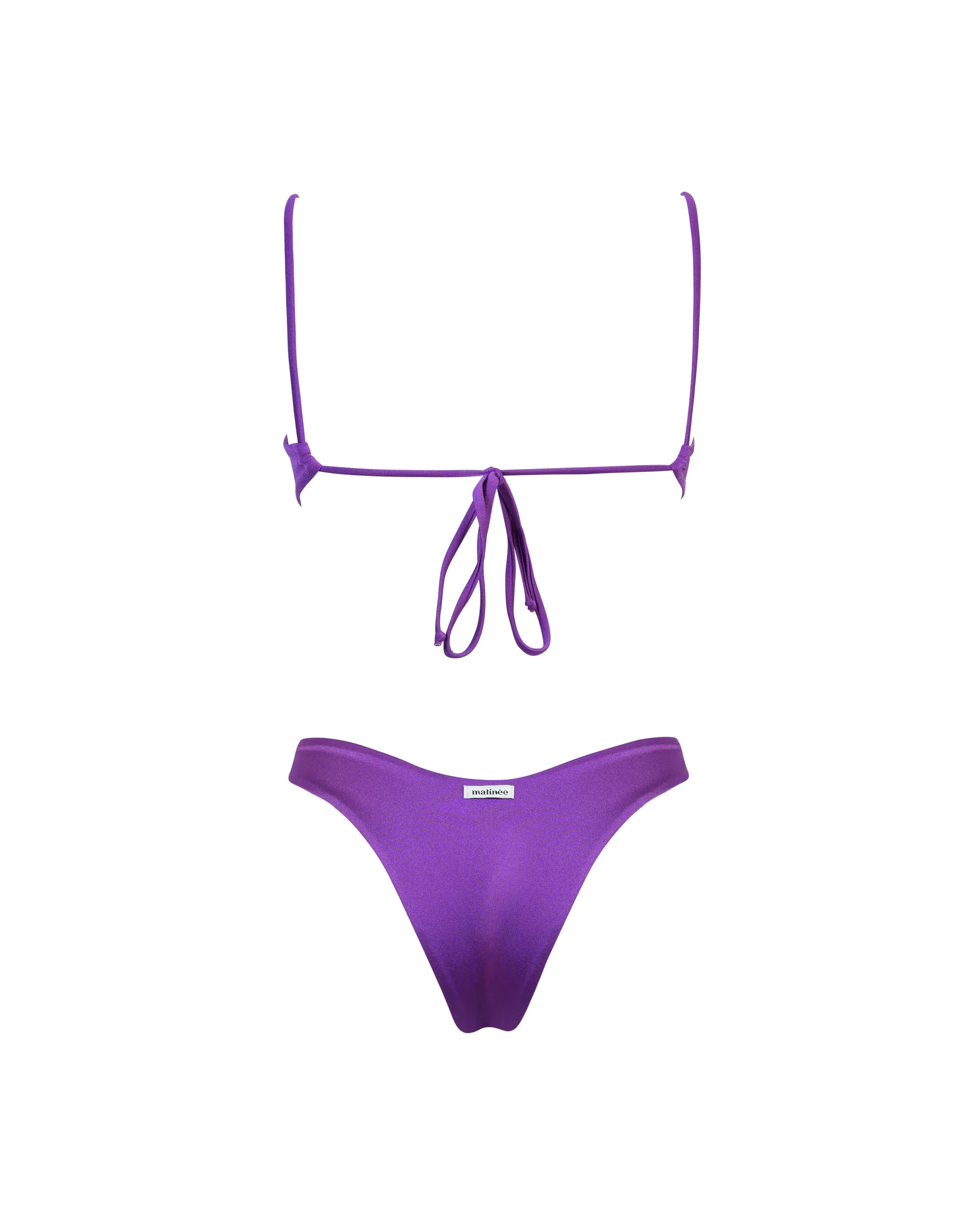 Tina is a bikini that combines a bandeau top with a low neckline, featuring removable padding, and Brazilian V-cut bottoms. The top has an adjustable tie closure for maximum customization.