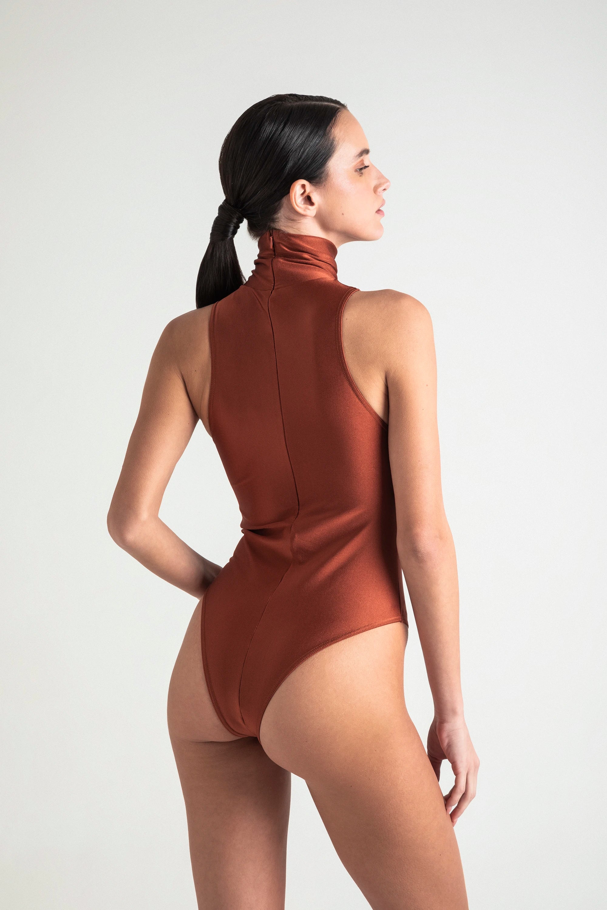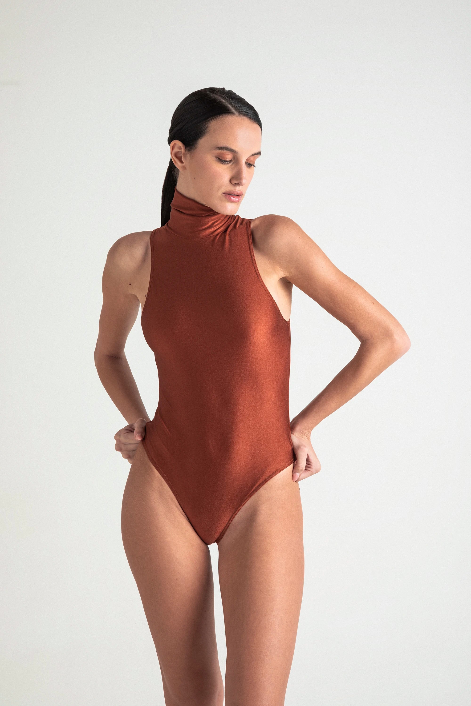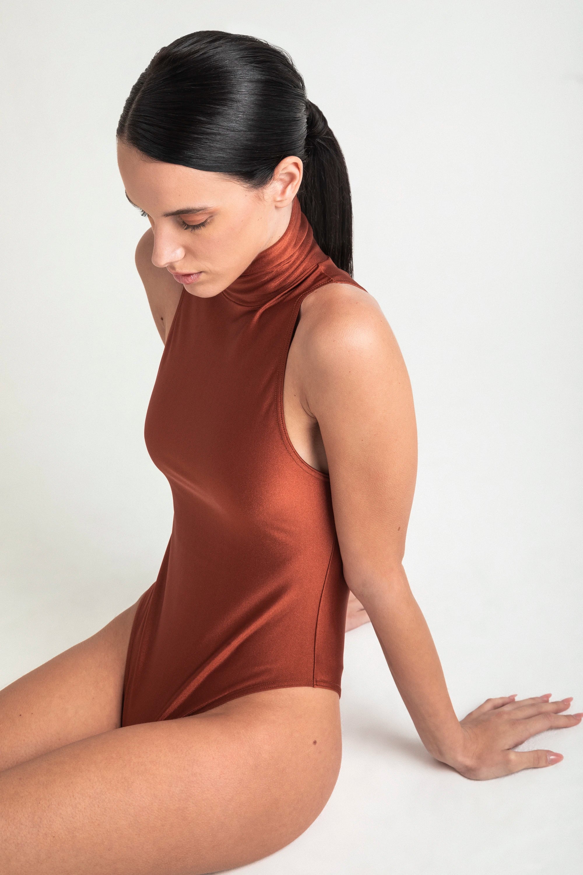 Body in lycra con collo alto e linea essenziale. Il design senza maniche mette in risalto le spalle e la pulizia delle forme, mentre il taglio sgambato dona slancio alla figura. La chiusura sul fondo con bottoni a pressione lo rende pratico e funzionale.