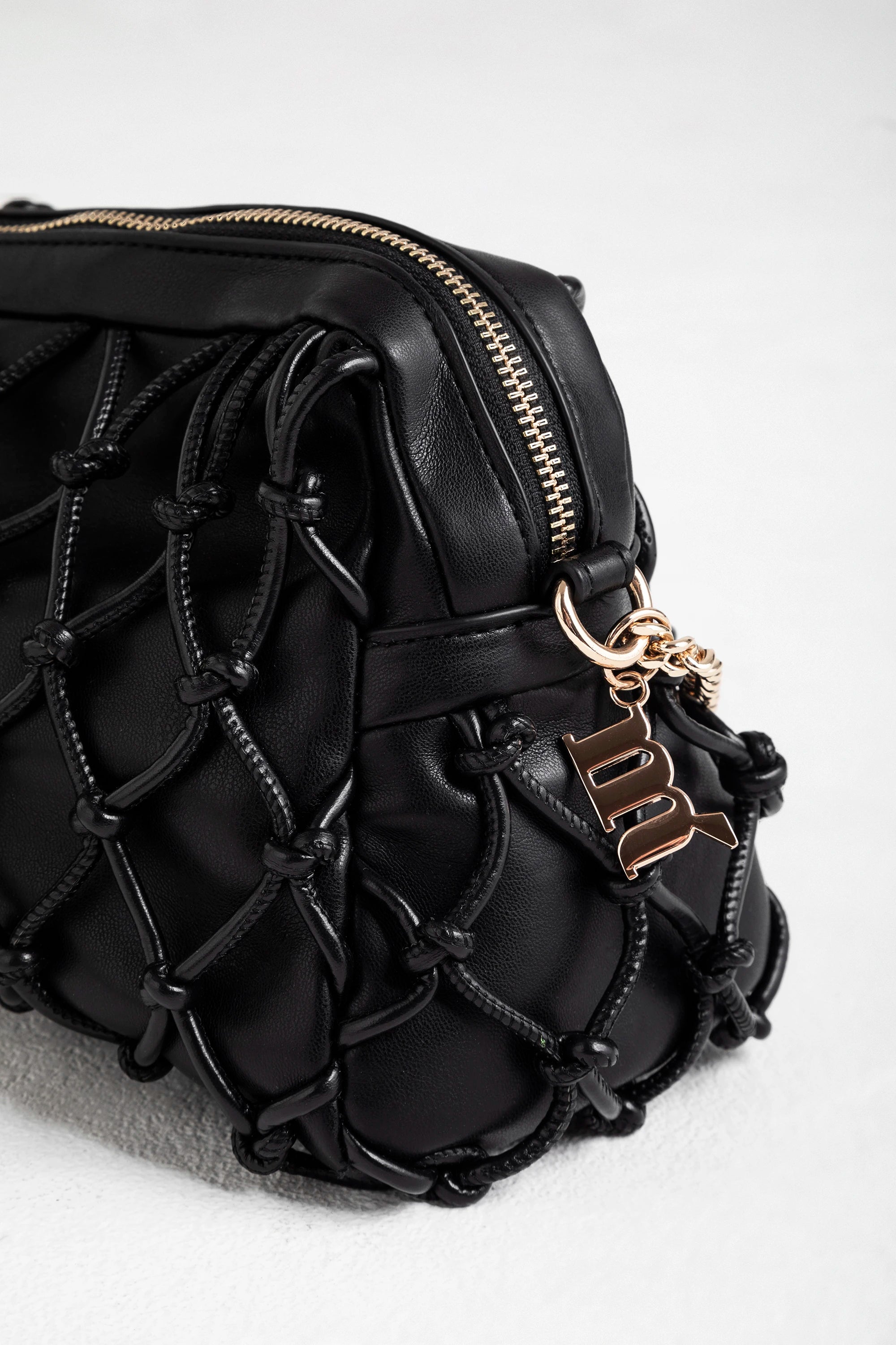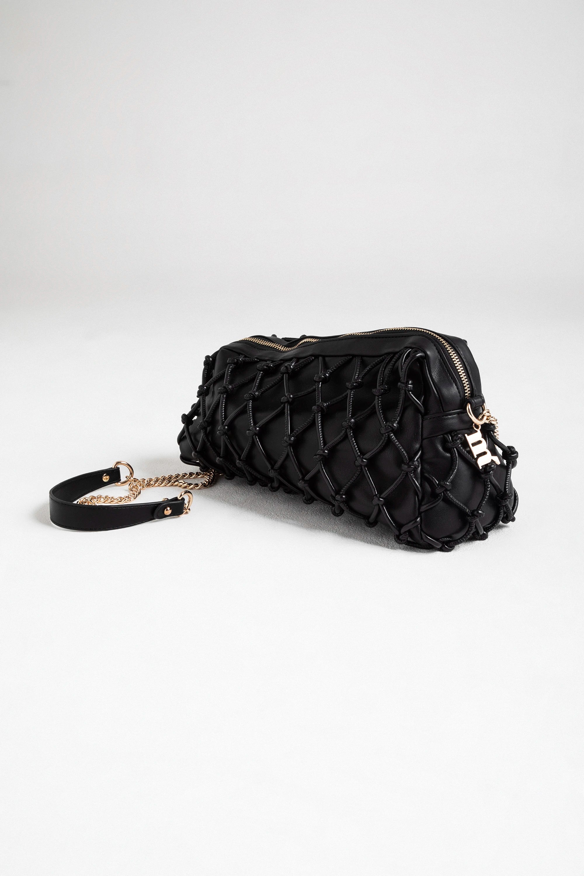 Borsa a spalla in pelle di colore nero, impreziosita da un intreccio esterno a rete che le conferisce carattere e tridimensionalità. La lavorazione a nodi regolari crea un effetto elegante e ricercato, mentre la catena in metallo dorato, con inserto in pelle, aggiunge un tocco luminoso e sofisticato.