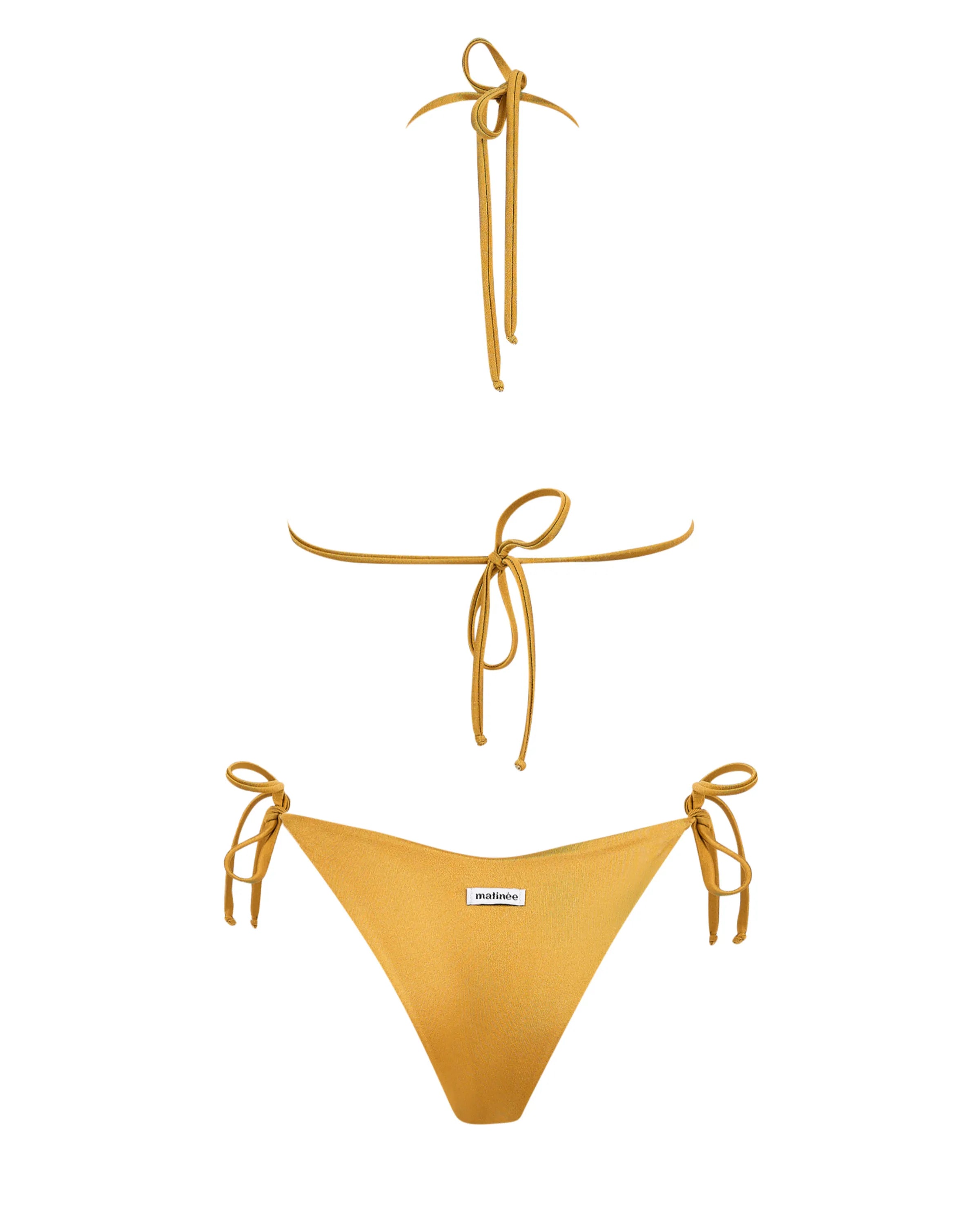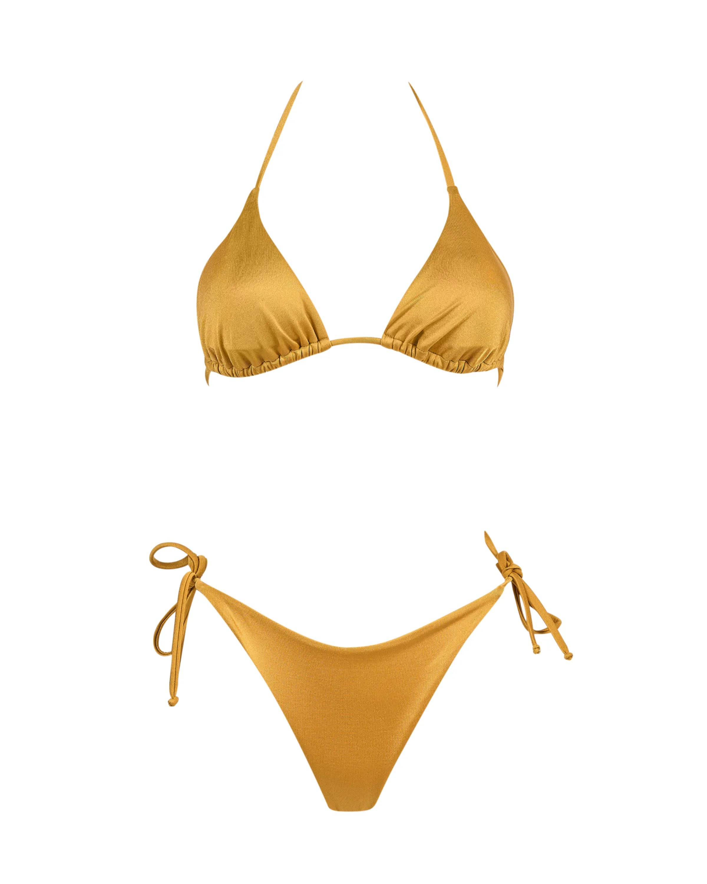 Kate è il bikini must-have dell’estate. Combina un top a triangolo con laccetti regolabili e coppe estraibili e uno slip, anch’esso con laccetti regolabili laterali e una sgambatura a brasiliana. Realizzato in lycra lucida, un materiale elastico e brillante che esalta le forme con eleganza. In tinta unita di colore giallo ocra.