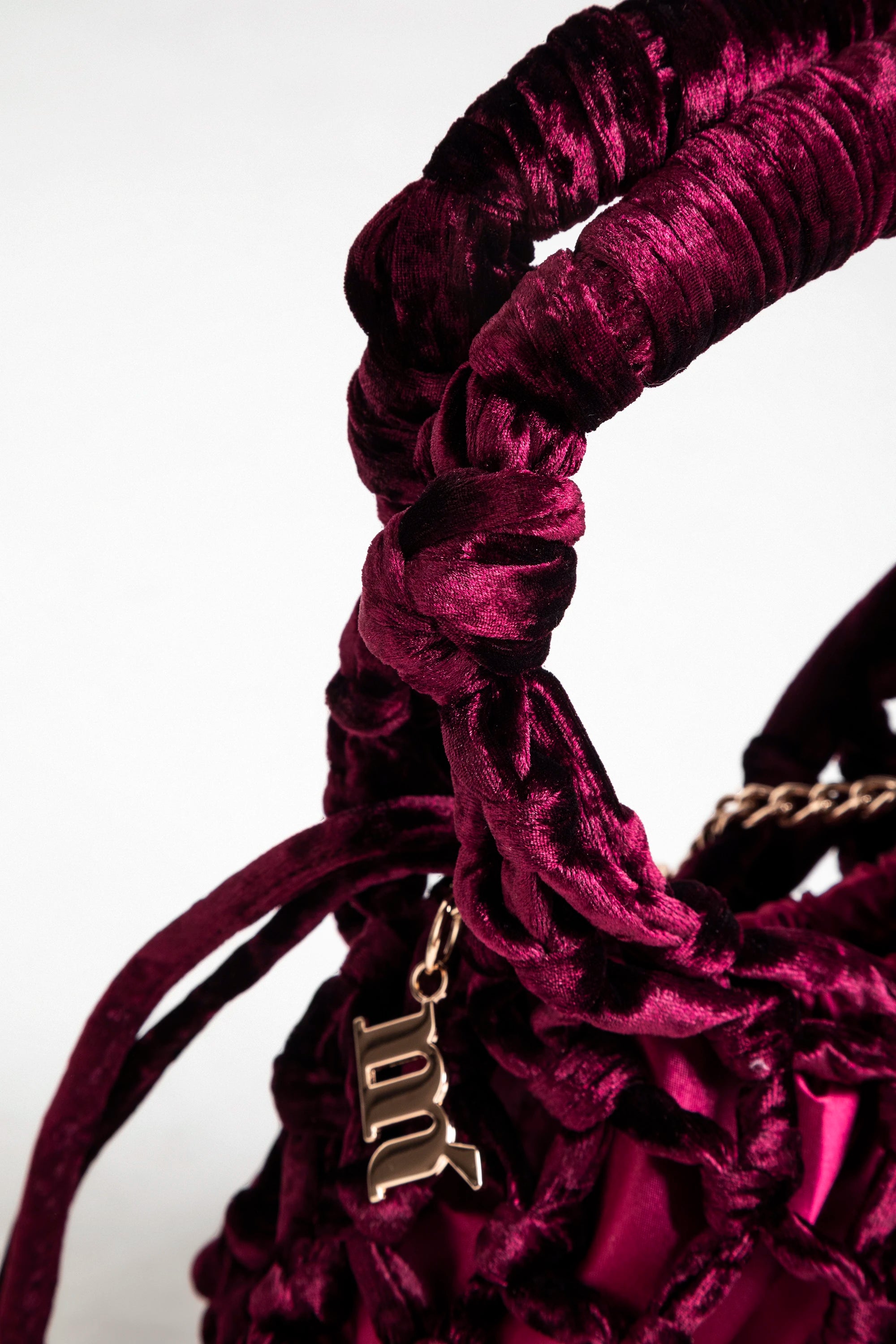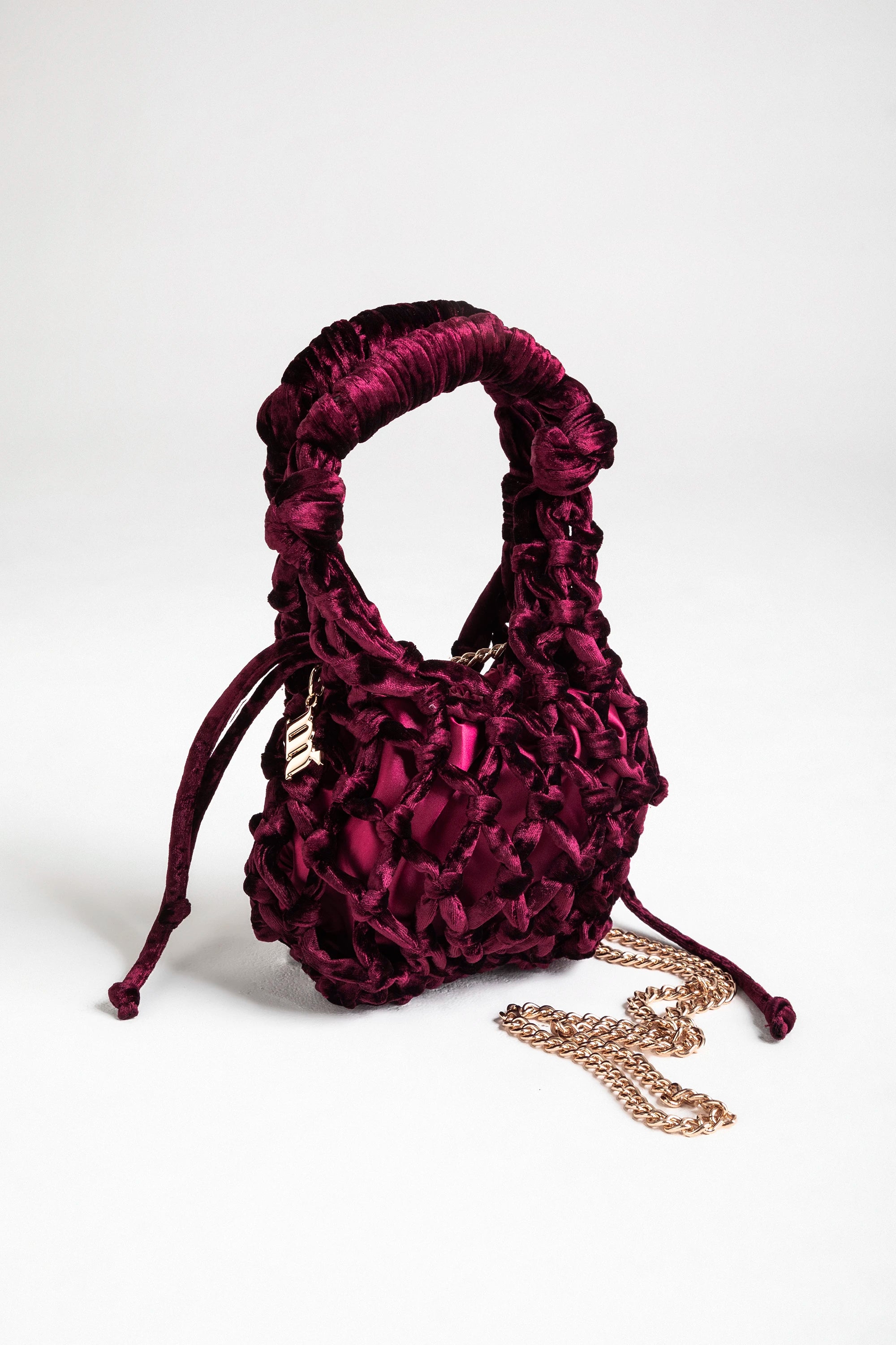 Borsa a mano in velluto di colore vino, caratterizzata da una lavorazione intrecciata che avvolge la struttura con una rete morbida e voluminosa. Le maniglie rivestite nello stesso materiale creano continuità con il design e aggiungono un tocco di morbidezza tattile, mentre la tracolla a catena dorata offre un’alternativa elegante per portarla a spalla.